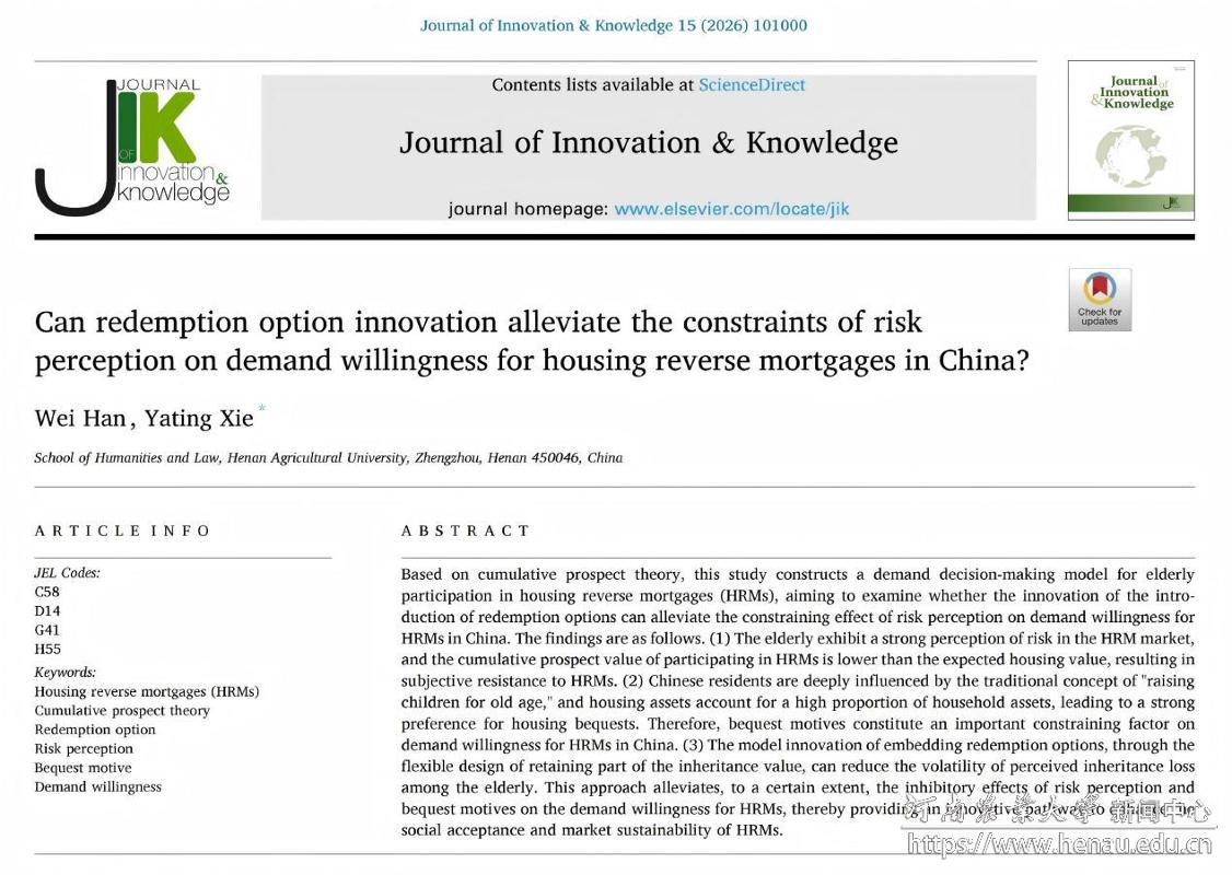 Study on Housing Reverse Mortgage Demand in China Published in Journal of Innovation & Knowledge